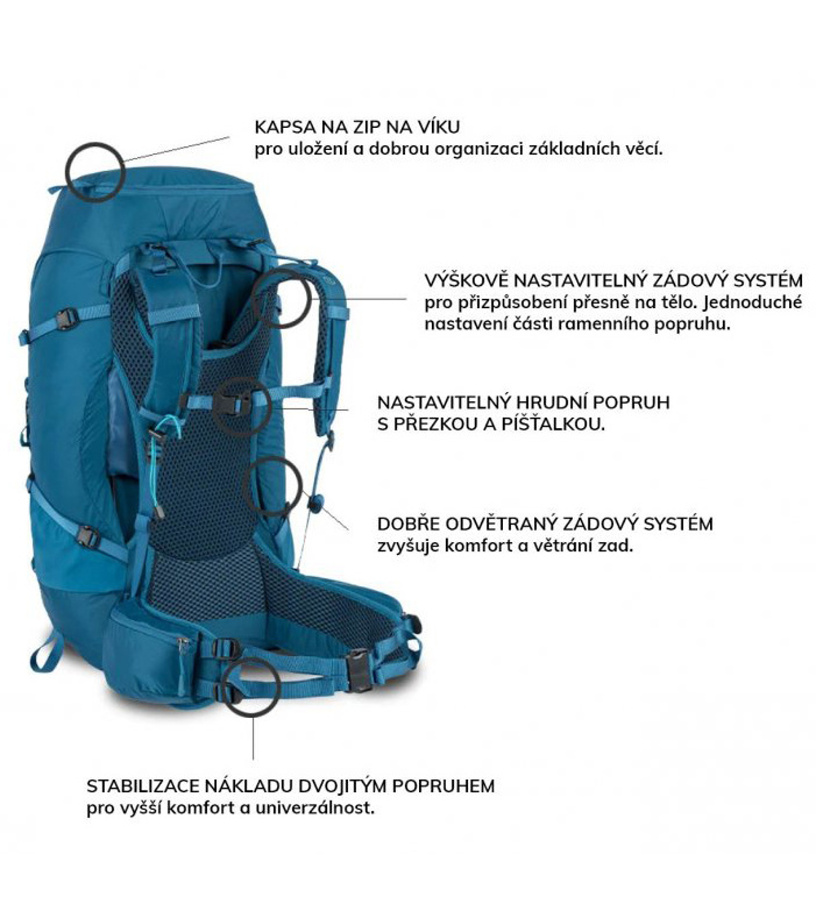 Stabilizace zatížení dvojitými popruhy na ramenních popruzích a bederním pásu