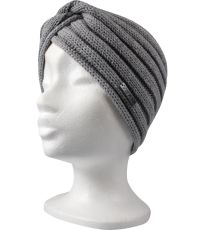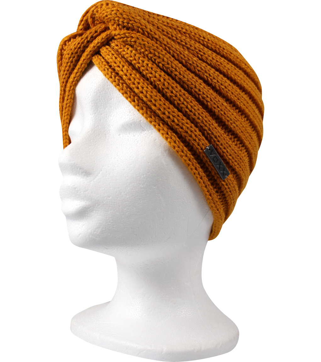 Dámská elegantní pletená čelenka s přetočením na přední straně, zdobená kovovým štítkem VoXX.