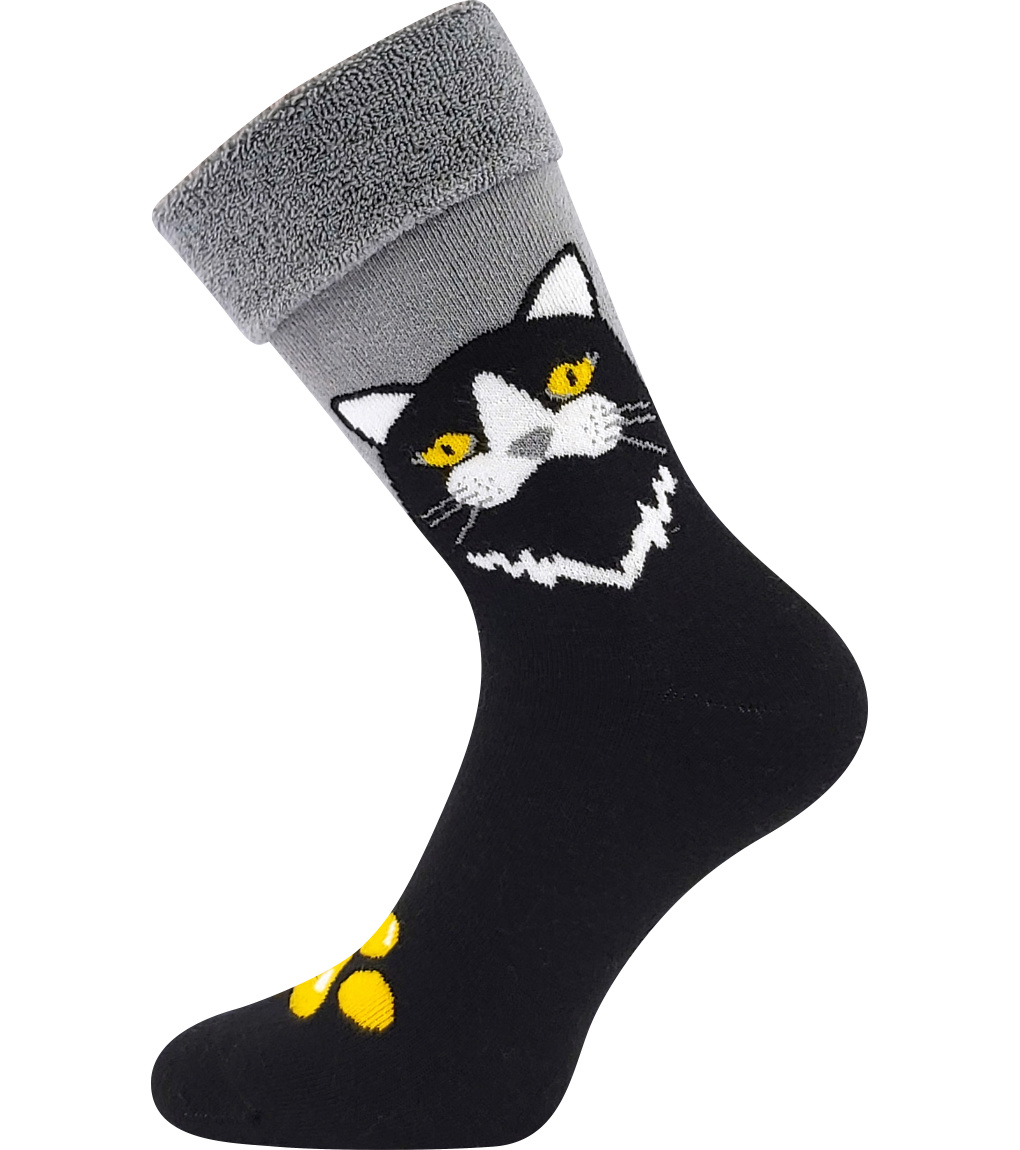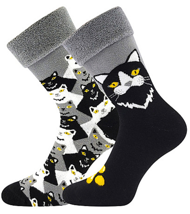 Dámské silné ponožky Lonka® LÍZA s obrázky kočiček. Ponožky mají vysoký podíl bavlny a pružného elastanu. Díky tomu jsou ponožky jemné na omak, příjemné na nošení, dobře pohlcují vlhkost a zároveň dobře drží na noze. Teplé ponožky jsou z jemného a měkkého froté, jsou tak velice příjemné, vhodné na běžné nošení v chladných a sychravých dnech. Špici mají ponožky spojenou řetízkováním a spoj nikde netlačí. S ohrnovacím lemem nebo se dají nosit i natažené. Párování 1+1, ve kterém je každá ponožka jiná, ale dohromady tvoří dokonalý pár. Pokud chcete mít dvě stejné ponožky, objednejte si dva páry.