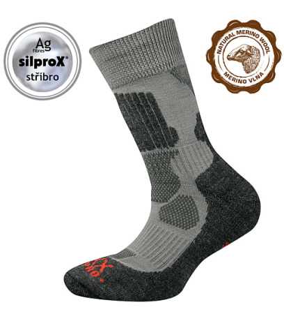 Dokonalá kombinace Merino vlny a značkového polypropylenu s ionty stříbra. Tato kombinace zajišťuje výrazně vyšší odolnost proti opotřebení, vysoký tepelně izolační komfort a antibakteriální účinky. Ponožky z tohoto materiálu zajišťují ideální teplotu pro tělo i v nejhorších klimatických podmínkách.