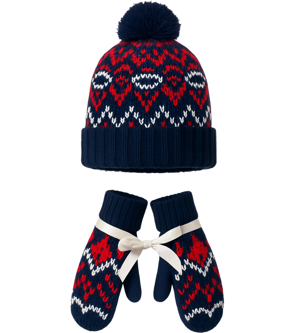 Zimní set čepice a palčáků s pleteným vzorem a bambulí je ideální volbou pro chladné dny. Měkký a hřejivý materiál poskytuje skvělé tepelný komfort, zatímco stylový design s tradičním vzorem dodává zimnímu outfitu šmrnc.
