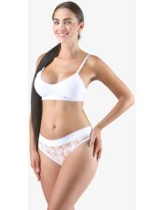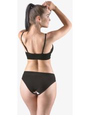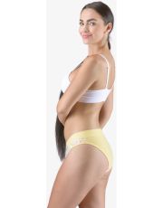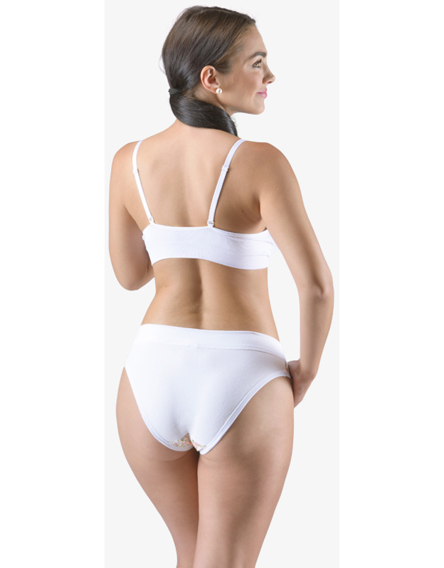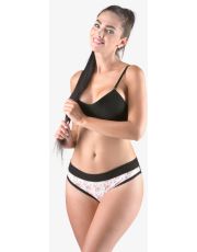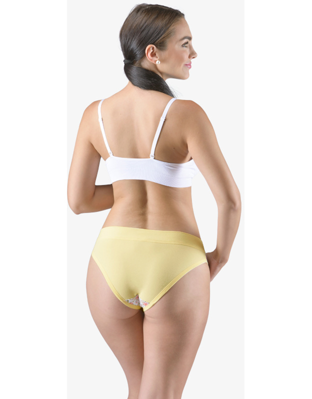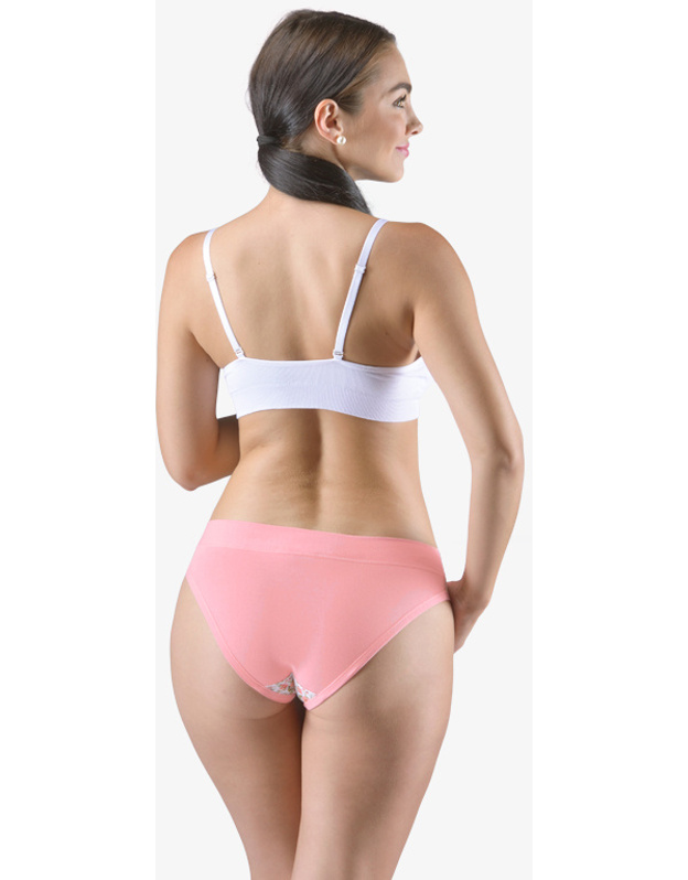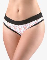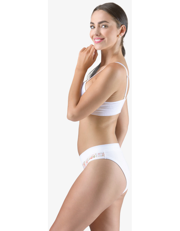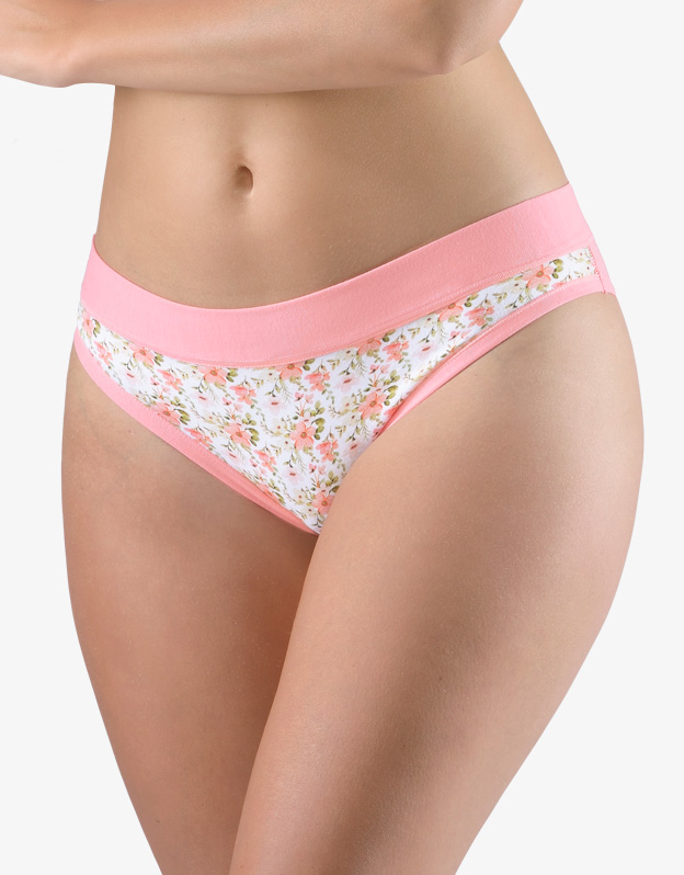 Bokové kalhotky se širším bokem, bokovky, a se širším pasovým lemem, dámské šité prádlo. Pasový kraj je začištěný širším lemem ze stejného materiálu. Nohavičky jsou začištěné úzkým lemem ze stejného materiálu. Přední díl je potištěný. Zadní díl a lemy jsou jednobarevné.