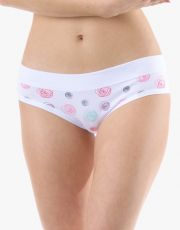 Bokové kalhotky francouzského střihu se širokým bokem a širším pasovým lemem, dámské šité prádlo. Pasový kraj je začištěný širším lemem ze stejného materiálu. Nohavičky jsou začištěné úzkým lemem ze stejného materiálu. Přední díl je potištěný. Zadní díl a lemy jsou jednobarevné.