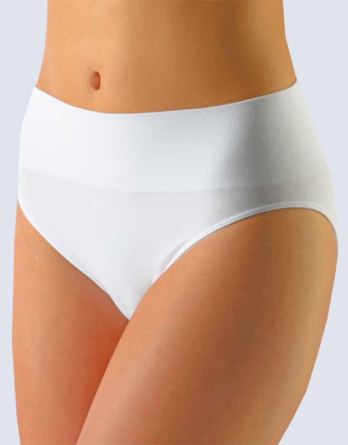 Kalhotky klasického střihu se širokým bokem a širokou pasovou záložkou, dámské bezešvé prádlo. Pasový kraj je zesílený a zapravený bezešvým způsobem. V nohavičkách je zašitá úzká pruženka. Kalhotky jsou jednobarevné. Jsou bez loga.
