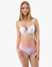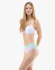Kalhotky klasického střihu se širším pasovým lemem, dámské šité prádlo. Pasový kraj je začištěný širším lemem ze stejného materiálu. Nohavičky jsou začištěné úzkým lemem ze stejného materiálu. Přední díl je potištěný. Zadní díl a lemy jsou jednobarevné.