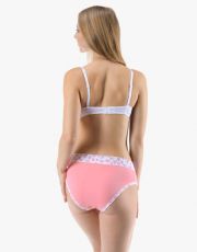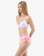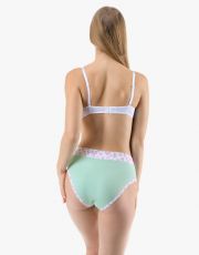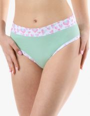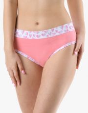 Kalhotky klasického střihu se širším pasovým lemem, dámské šité prádlo. Pasový kraj je začištěný širším lemem ze stejného materiálu. Nohavičky jsou začištěné úzkým lemem ze stejného materiálu. Přední díl je jednobarevný, lemy v pase a v nohavičkách jsou potištěné.