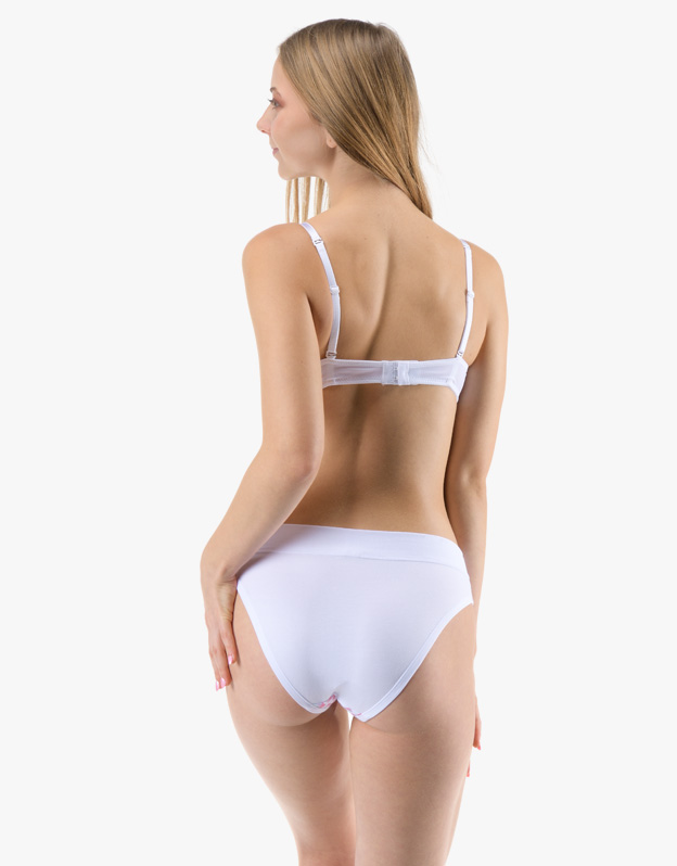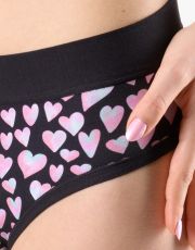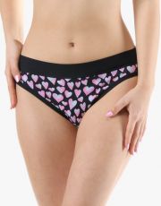 Kalhotky klasického střihu s úzkým bokem a širším pasovým lemem, dámské šité prádlo. Pasový kraj je začištěný širším lemem ze stejného materiálu. Nohavičky jsou začištěné úzkým lemem ze stejného materiálu. Přední díl je potištěný. Zadní díl a lemy jsou jednobarevné.