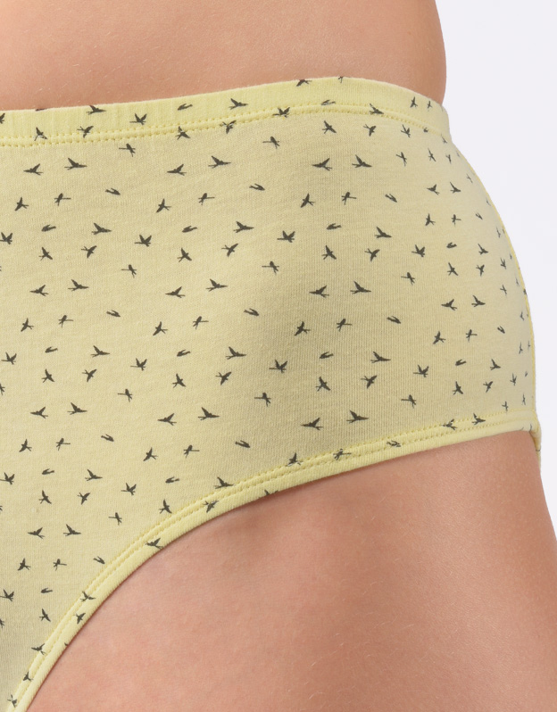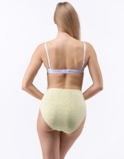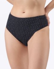 Kalhotky klasického střihu ve větších velikostech, dámské šité prádlo. V pasovém kraji je zašitá úzká pruženka. V nohavičkách je zašitá úzká pruženka. Kalhotky jsou potištěné drobným vzorem.