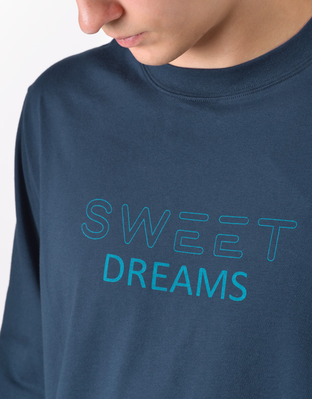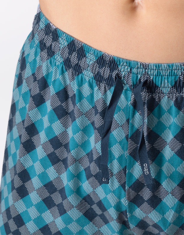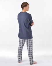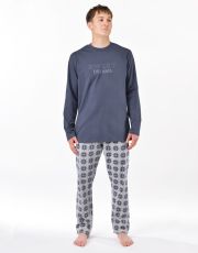 Pánské klasické pyžamo volného střihu z jemného úpletu Vám poskytne pohodlí během spánku. Kalhoty s výraznějším vzorem doplňuje triko s dlouhými rukávy a potiskem na hrudi.