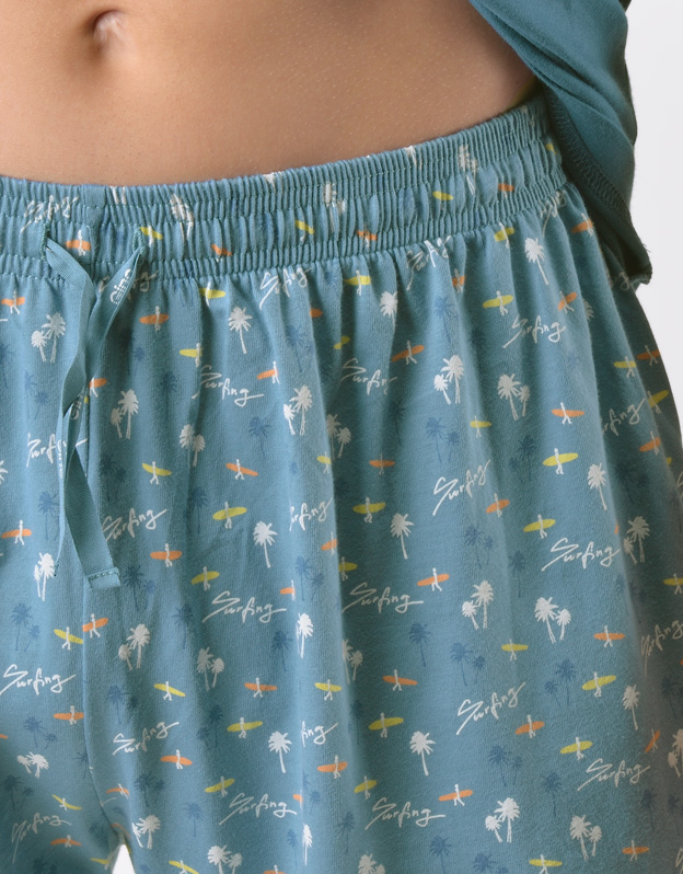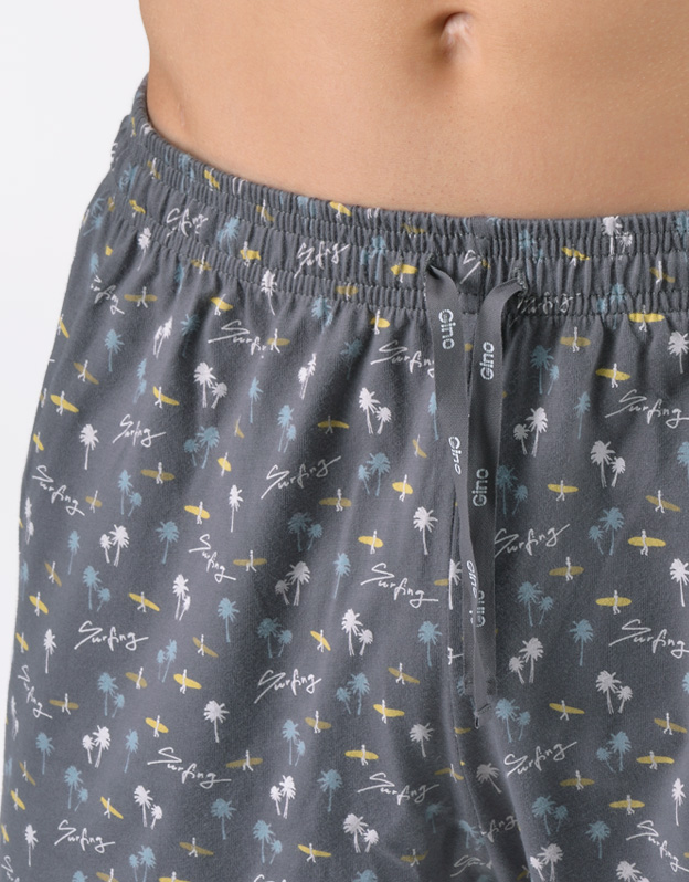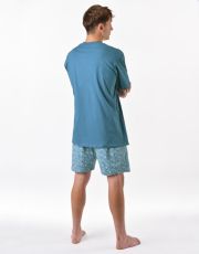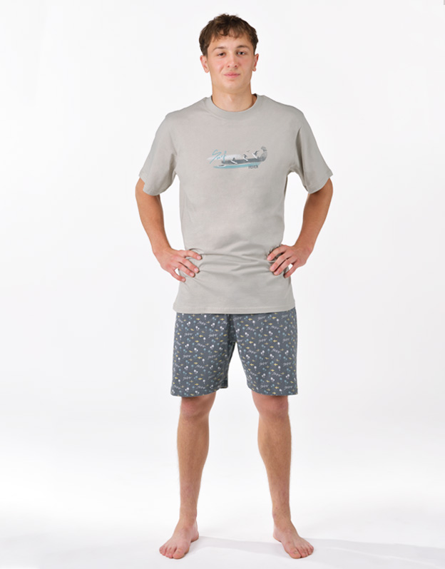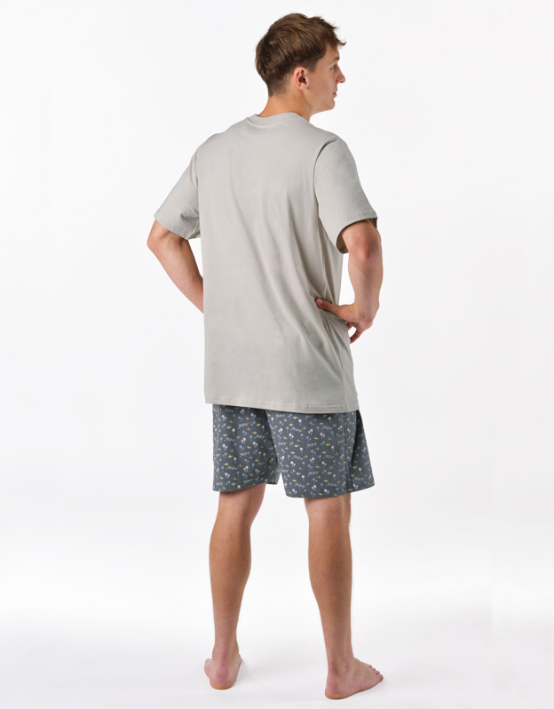 Pánské pyžamo volného střihu z jemného úpletu Vám poskytne pohodlí během spánku. Krátké kalhoty jsou potištěny drobným vzorem, triko s krátkými rukávy zdobí větší potisk na hrudi.