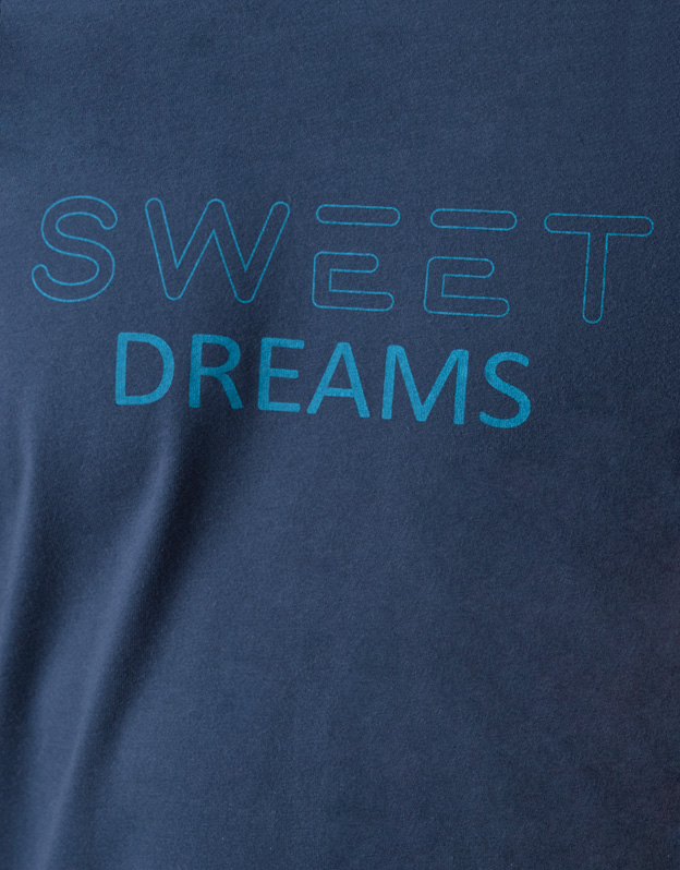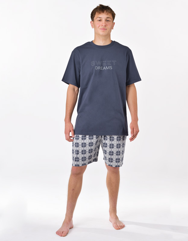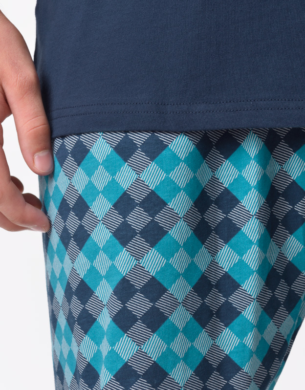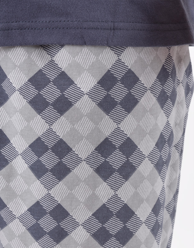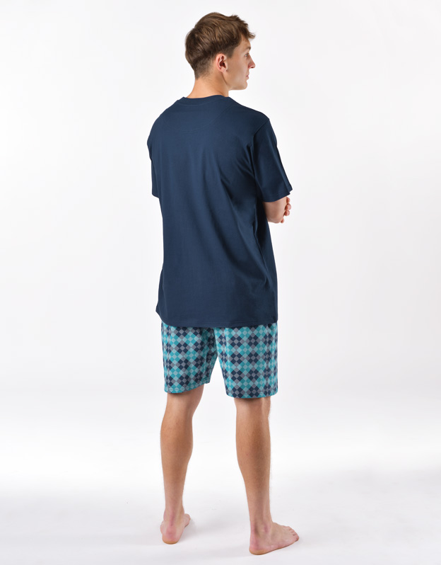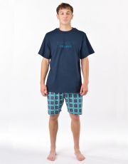 Pánské pyžamo volného střihu z jemného úpletu Vám poskytne pohodlí během spánku. Krátké kalhoty s potiskem doplňuje triko s větším potiskem na hrudi a krátkými rukávy.