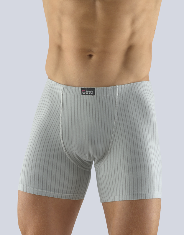 Boxerky s delší nohavičkou, pánské šité prádlo. V pasovém kraji je zašitá širší pruženka. Nohavičky jsou začištěné podehnutím. Zadní díl je členěný sedlem se dvěma švy. Boxerky jsou vyrobené z materiálu s vypletenými proužky.