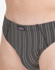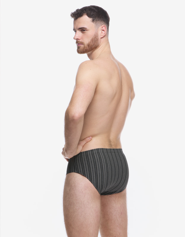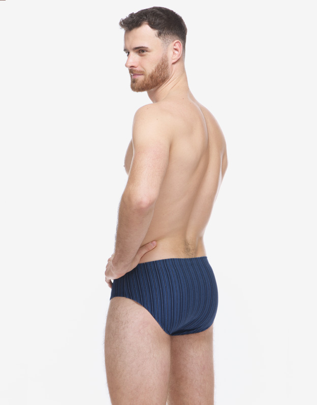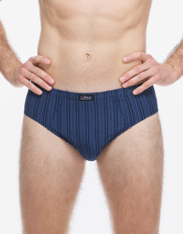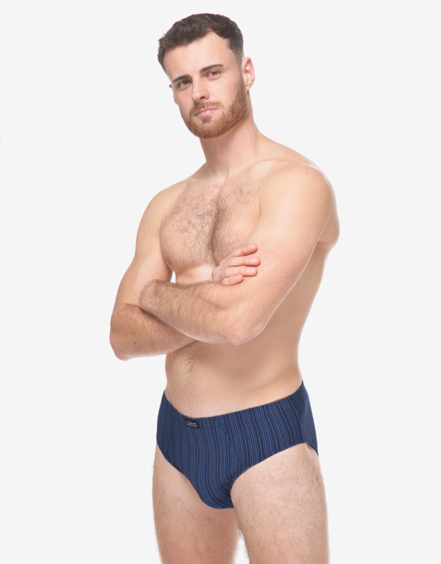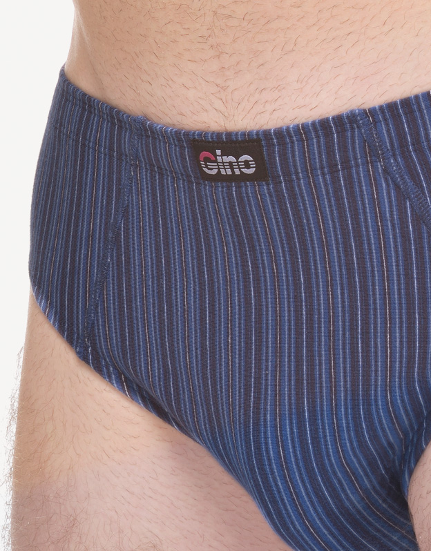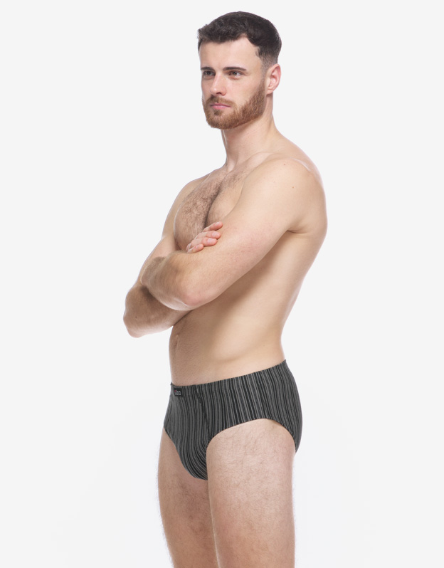 Slipy se širším bokem, pánské šité prádlo. V pasovém kraji je zašitá širší pruženka. V nohavičkách je zašitá úzká pruženka. Slipy jsou vyrobené z materiálu s vypletenými proužky.