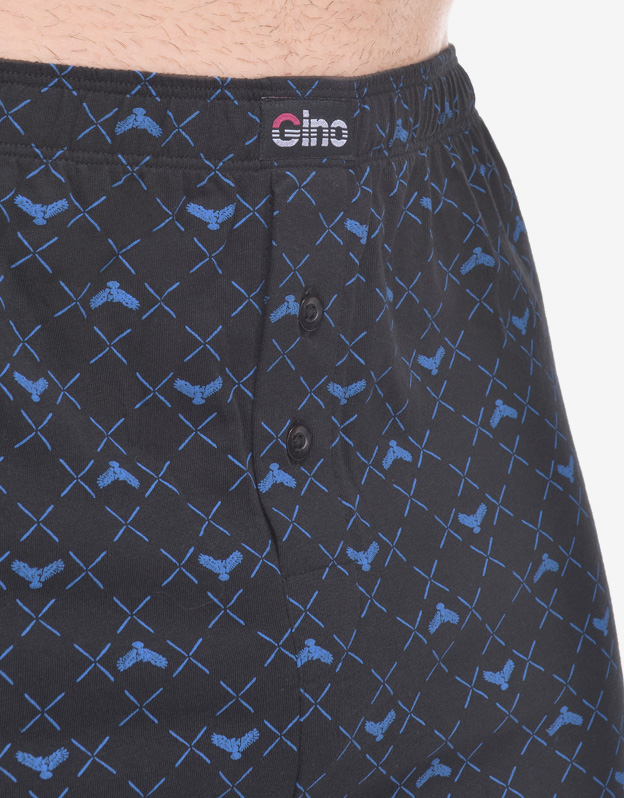 Volné trenky potěší každého, kdo má rád klasický pohodlný střih a přírodní materiály. Dobře padnoucí pasová guma a rozparek na dva knoflíky jsou samozřejmostí. Trenky jsou potištěné, v pase mají nášivku s logem Gino. Jsou vhodné pro každodenní nošení.